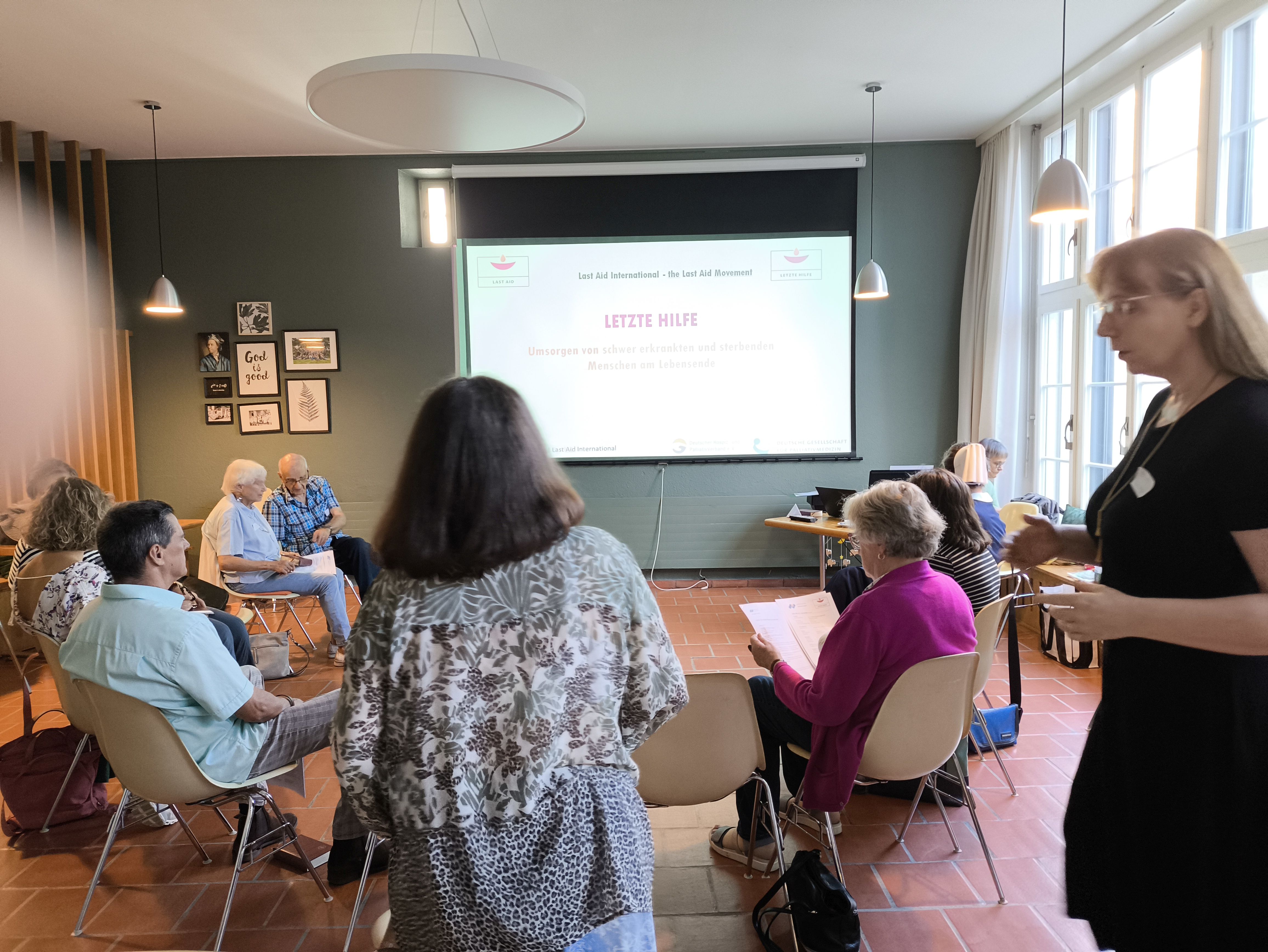 Wir bieten einen kompakten Kurs zur Letzten Hilfe an. In diesen Letzte Hilfe-Kursen lernen Interessierte, was sie für die ihnen Nahestehenden am Ende des Lebens tun können. Sterbebegleitung ist keine Wissenschaft, die nicht auch in der Familie und der Nachbarschaft möglich ist. Wir möchten Grundwissen weitergeben und ermutigen, sich Sterbenden zuzuwenden. Denn Zuwendung ist das, was wir alle am Ende des Lebens am meisten brauchen. Wir vermitteln Basiswissen, Orientierungen und einfache Handgriffe.